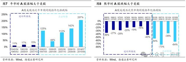 从咱们过往的分析中,美股能实现这样的投资体验的很重要的原因,就是长期有非常不错的回报,同时波动率又比A股小。上面我找了一篇研究报告,两国的股市在牛市中,咱们A股的收益率要比美股的收益高得多得多,不过到熊市的时候,咱们大A跌起来也是毫不含糊。